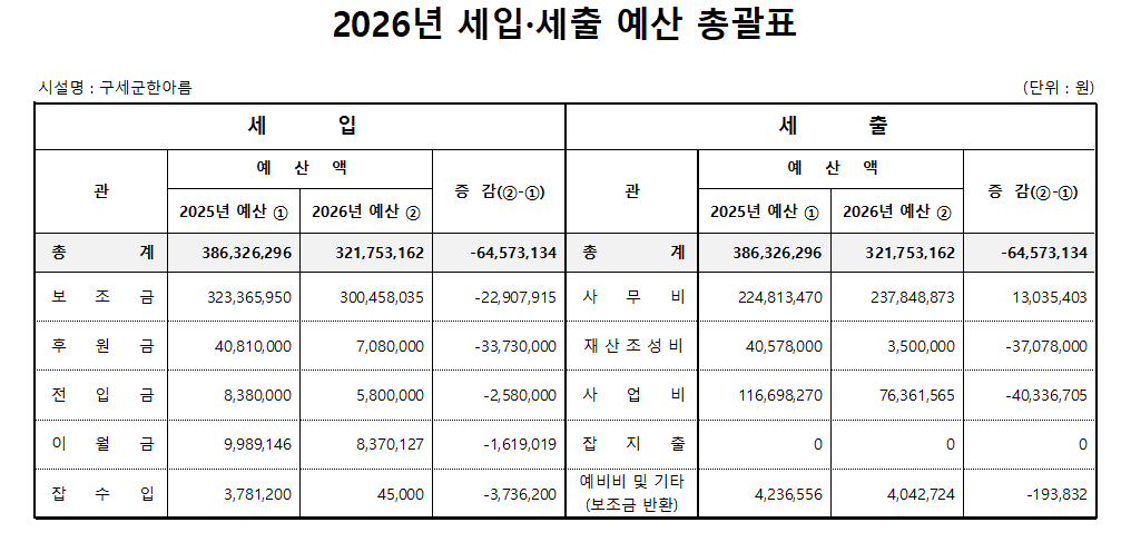 구세군한아름의 2026년 세입•세출 예산을 아래와 같이 공고합니다.