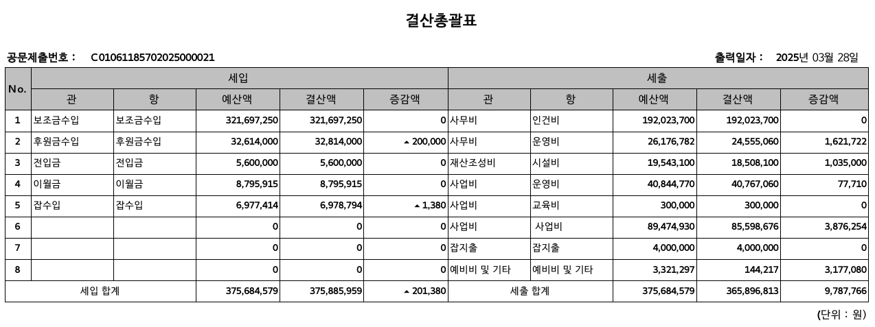 구세군한아름의 2024년 세입•세출 결산 및 2025년 세입•세출 예산을 아래와 같이 공고합니다.